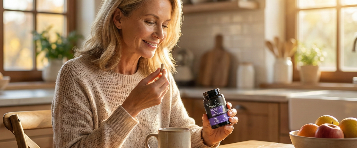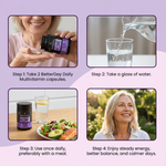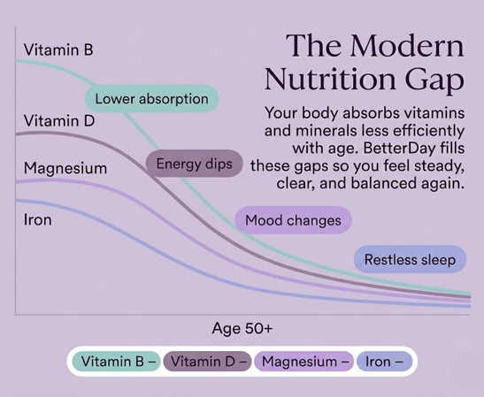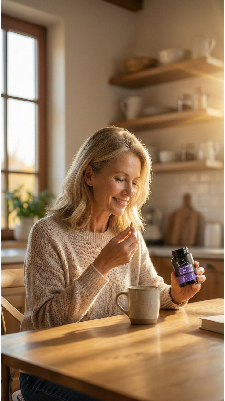 BetterDay supports you with a complete daily multivitamin that fills the nutrition gaps that naturally appear with age. This gentle formula helps your body feel steady again so you can move through your day with more clarity, calm, and confidence.