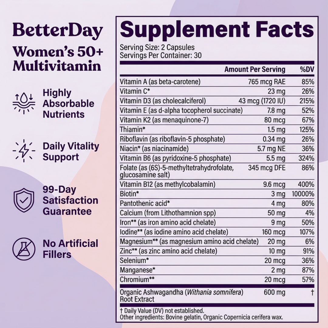 Transform your daily routine with BetterDay. The premium nutritional supplement that delivers essential nutrients your body struggles to absorb after 50. Just two simple capsules a day. Clinically proven ingredients to boost energy, improve sleep quality, support emotional balance, and enhance overall wellness as your body changes.