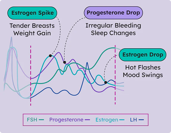 Hormonal chaos begins to ease → steadier cycles & fewer hot flashes